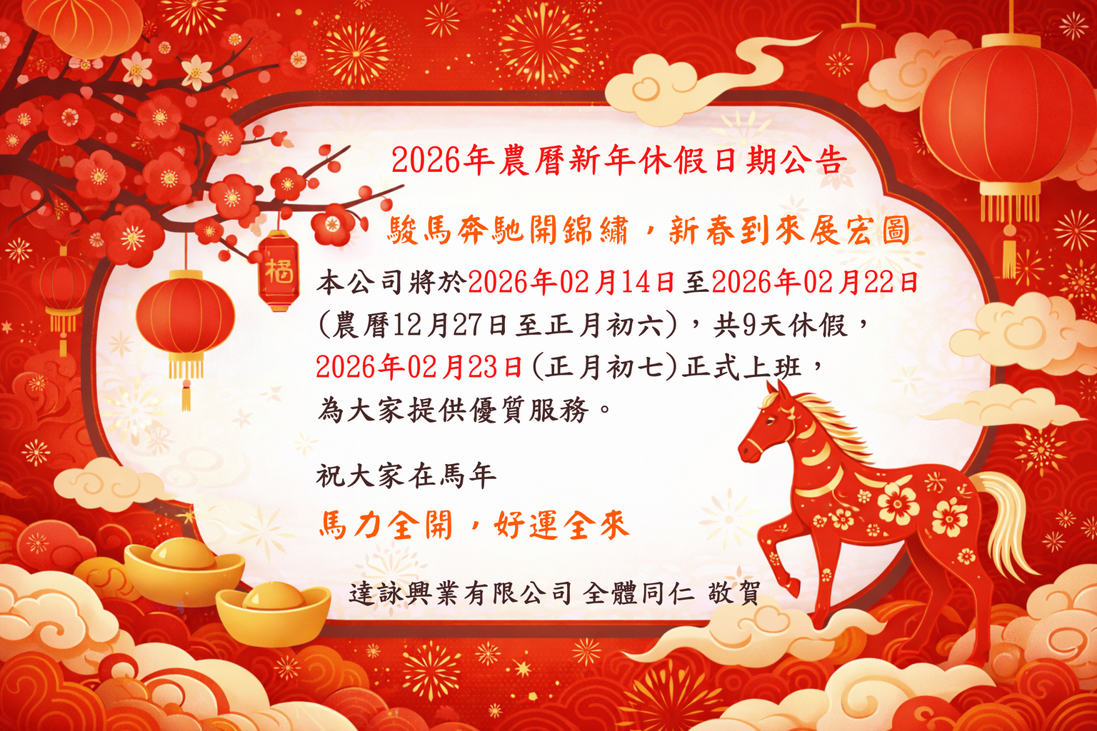本公司將於2026年02月14日至2026年02月22日(農曆12月27日至正月初六),共9天休假,